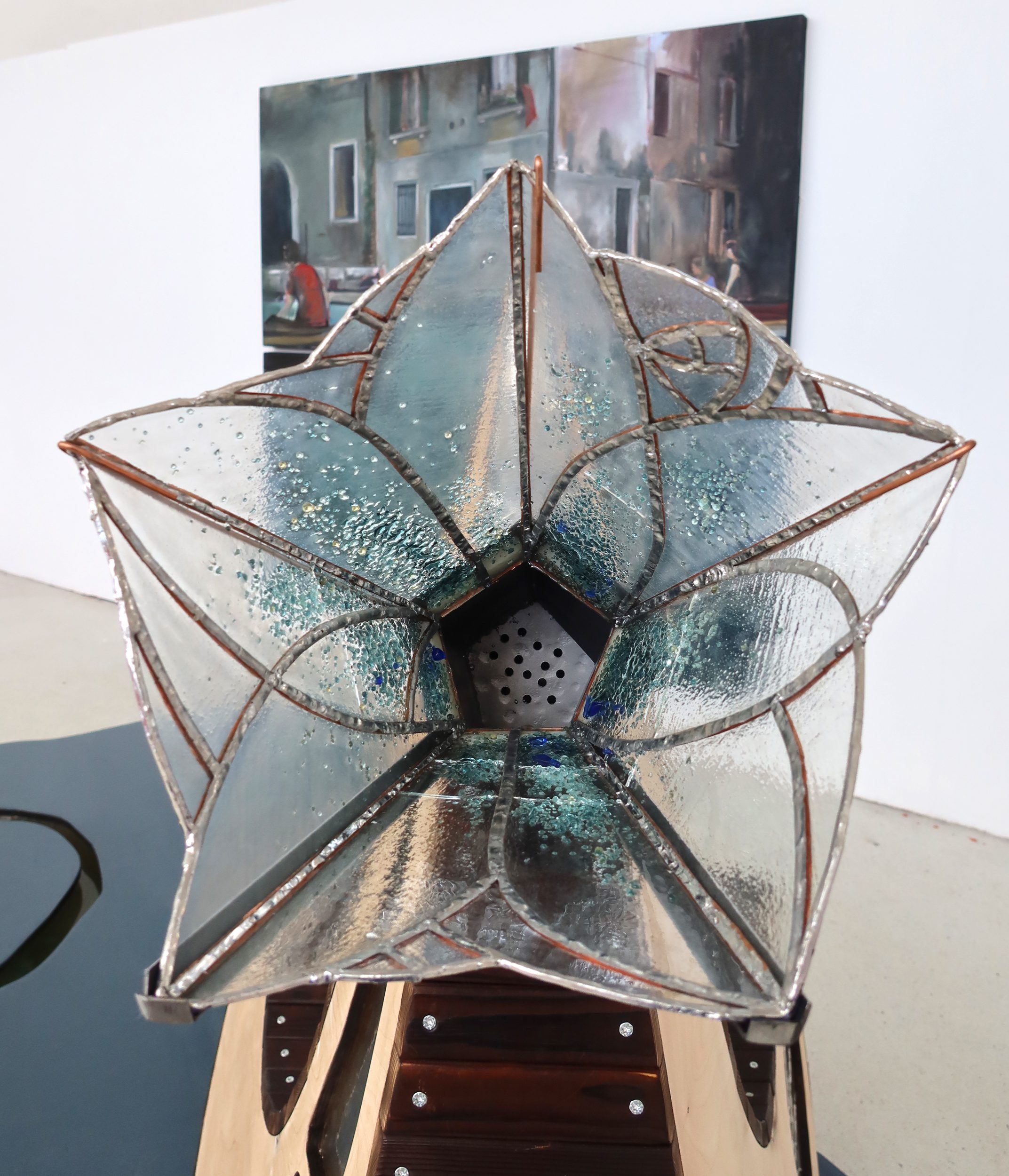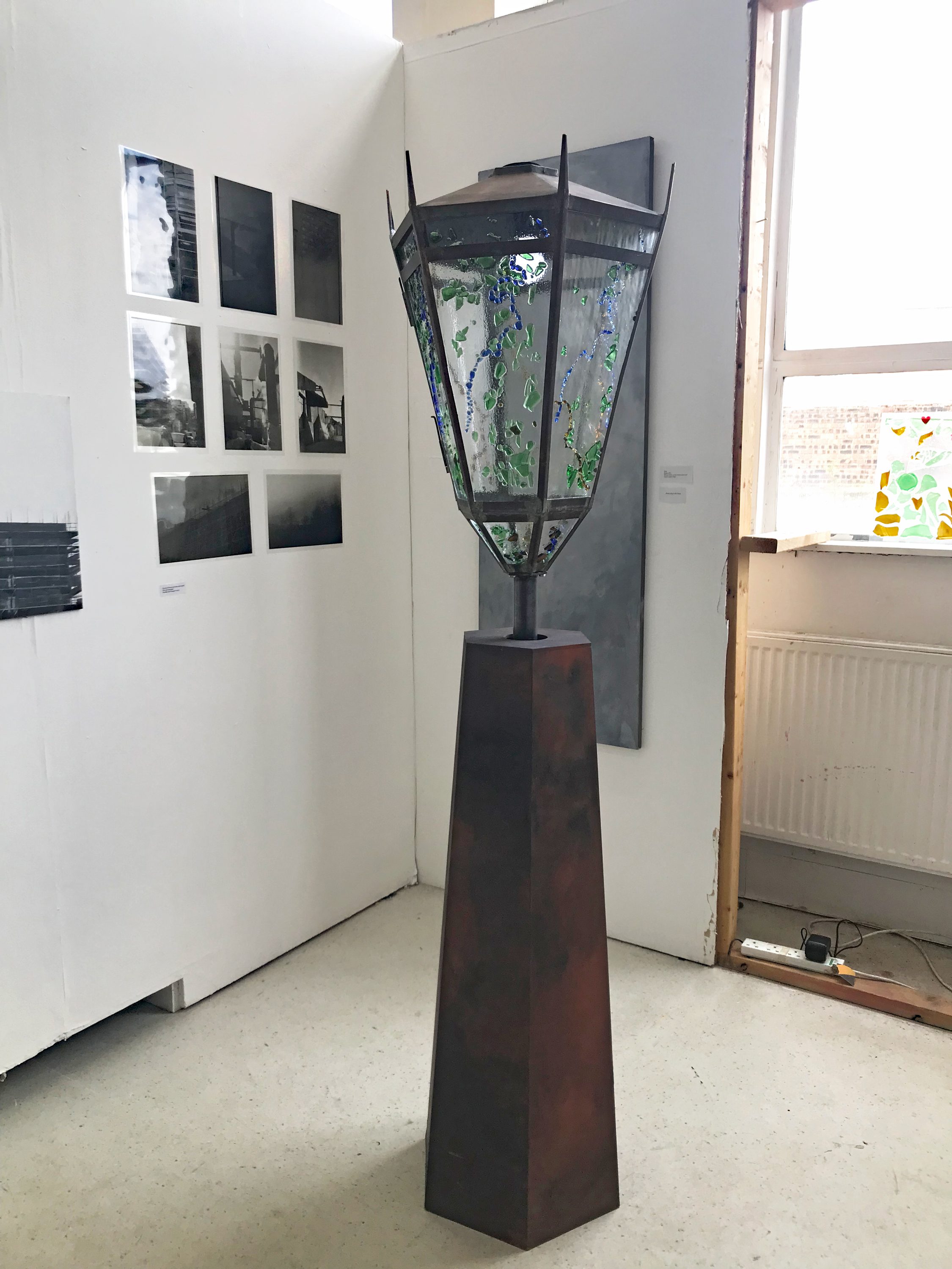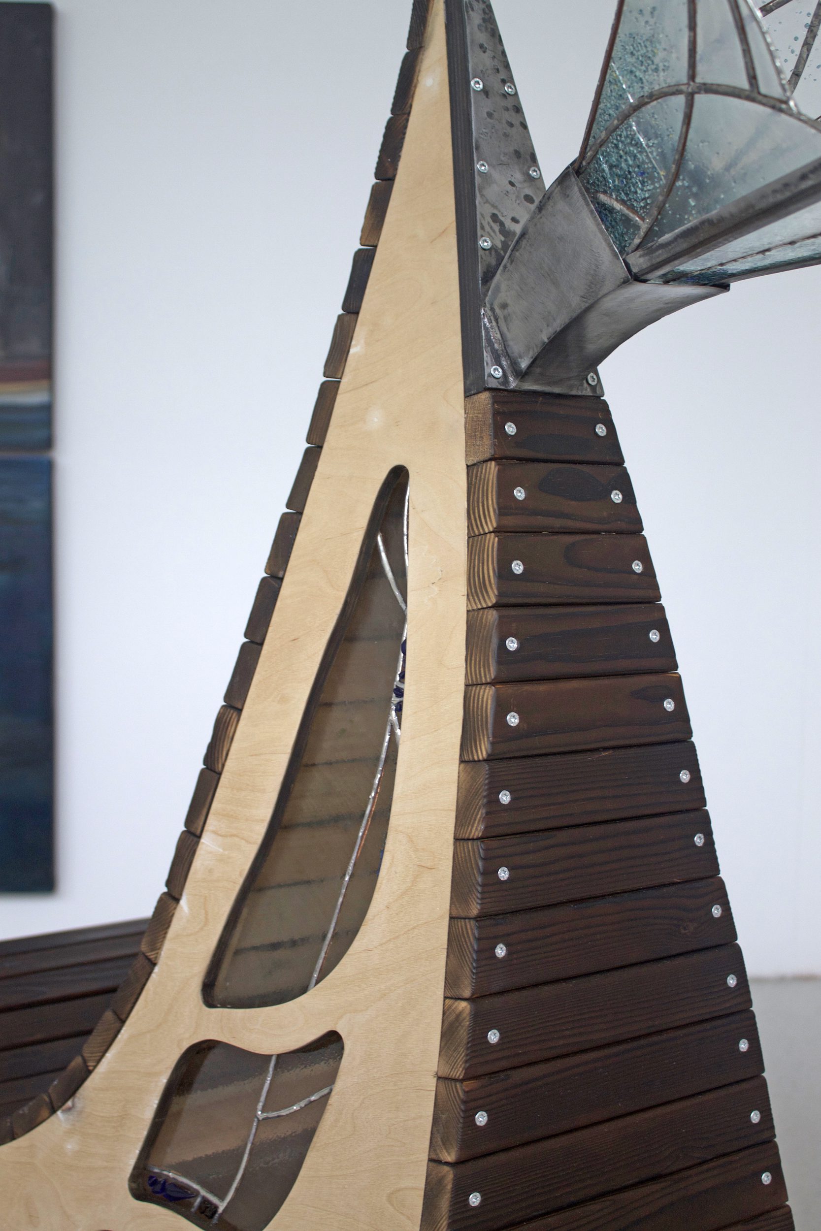 2023 Mixed media: wood, stained glass and found copper lamp head, 180 cm.