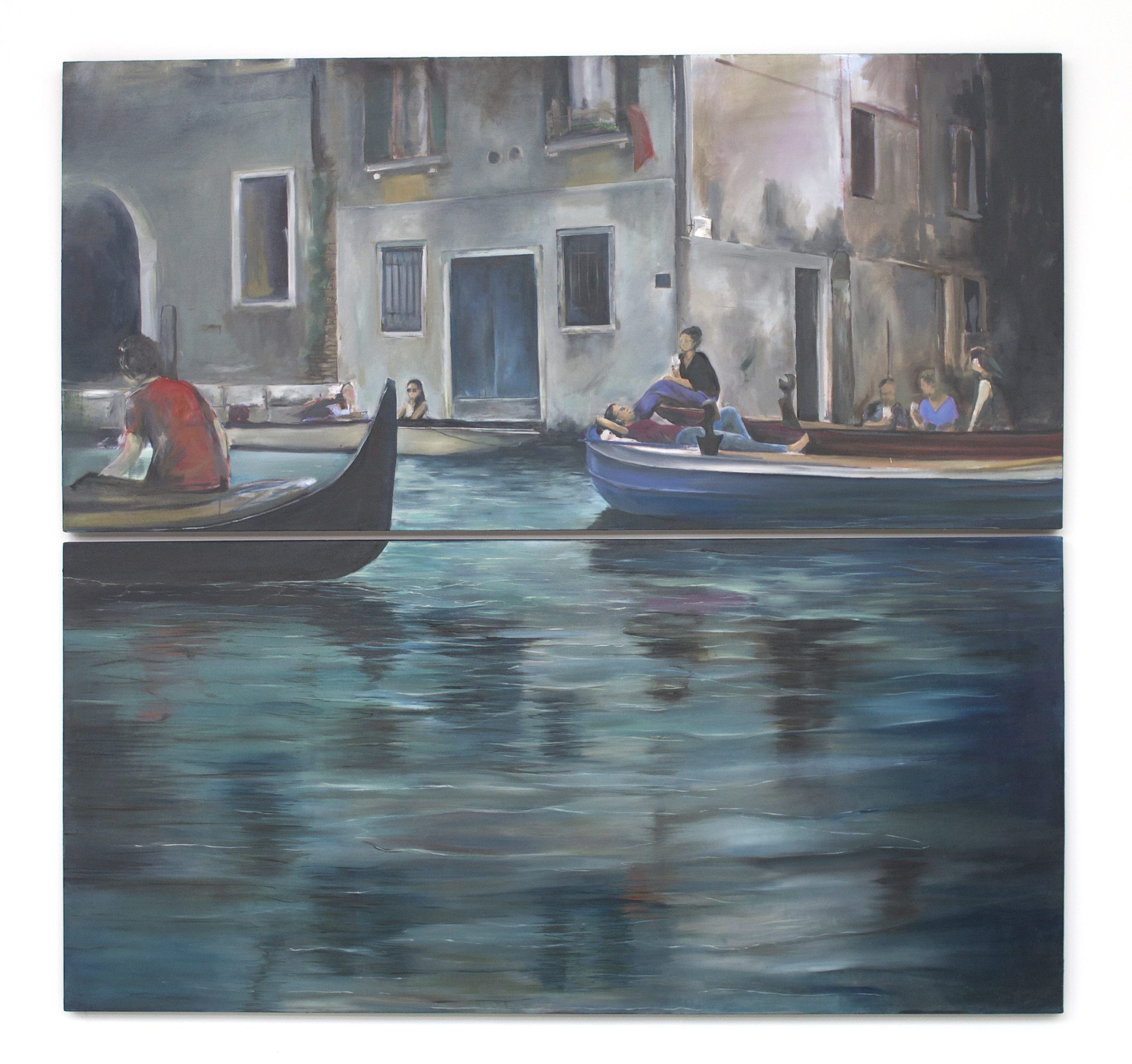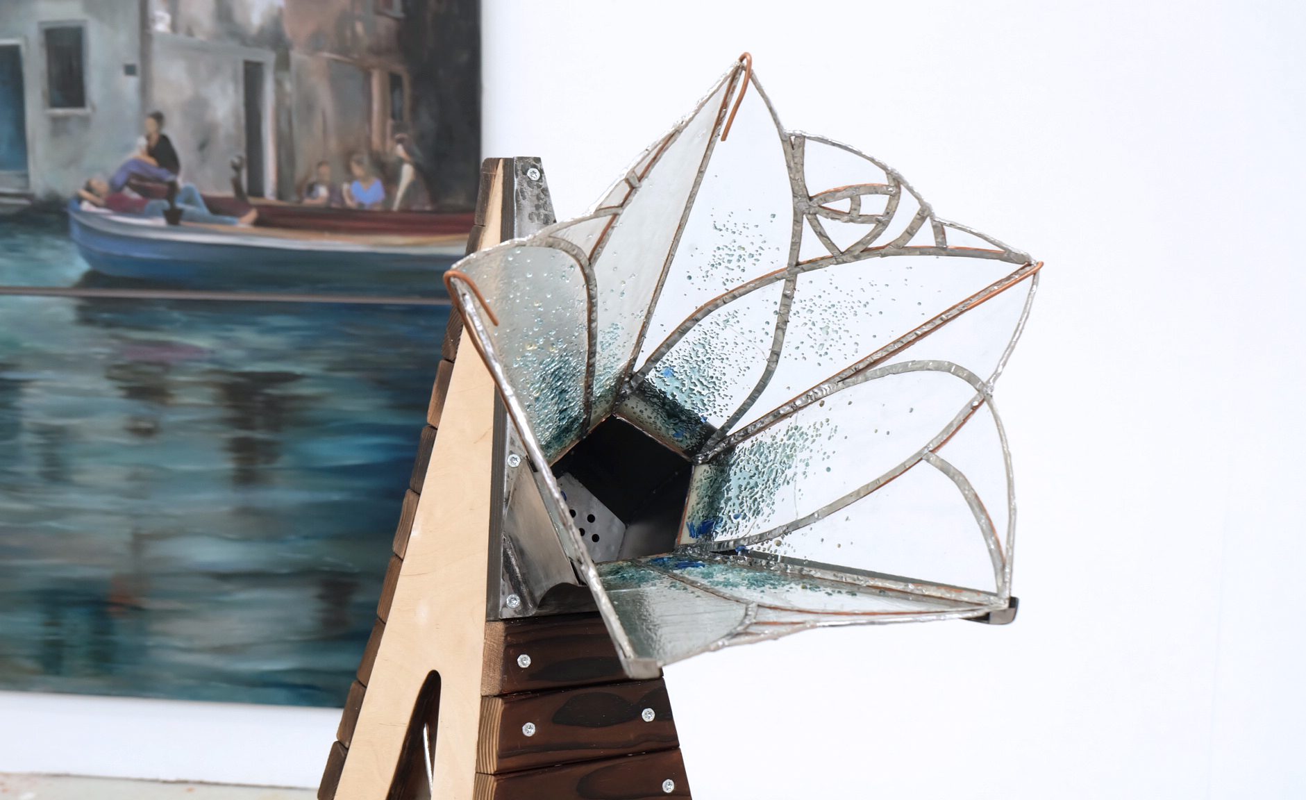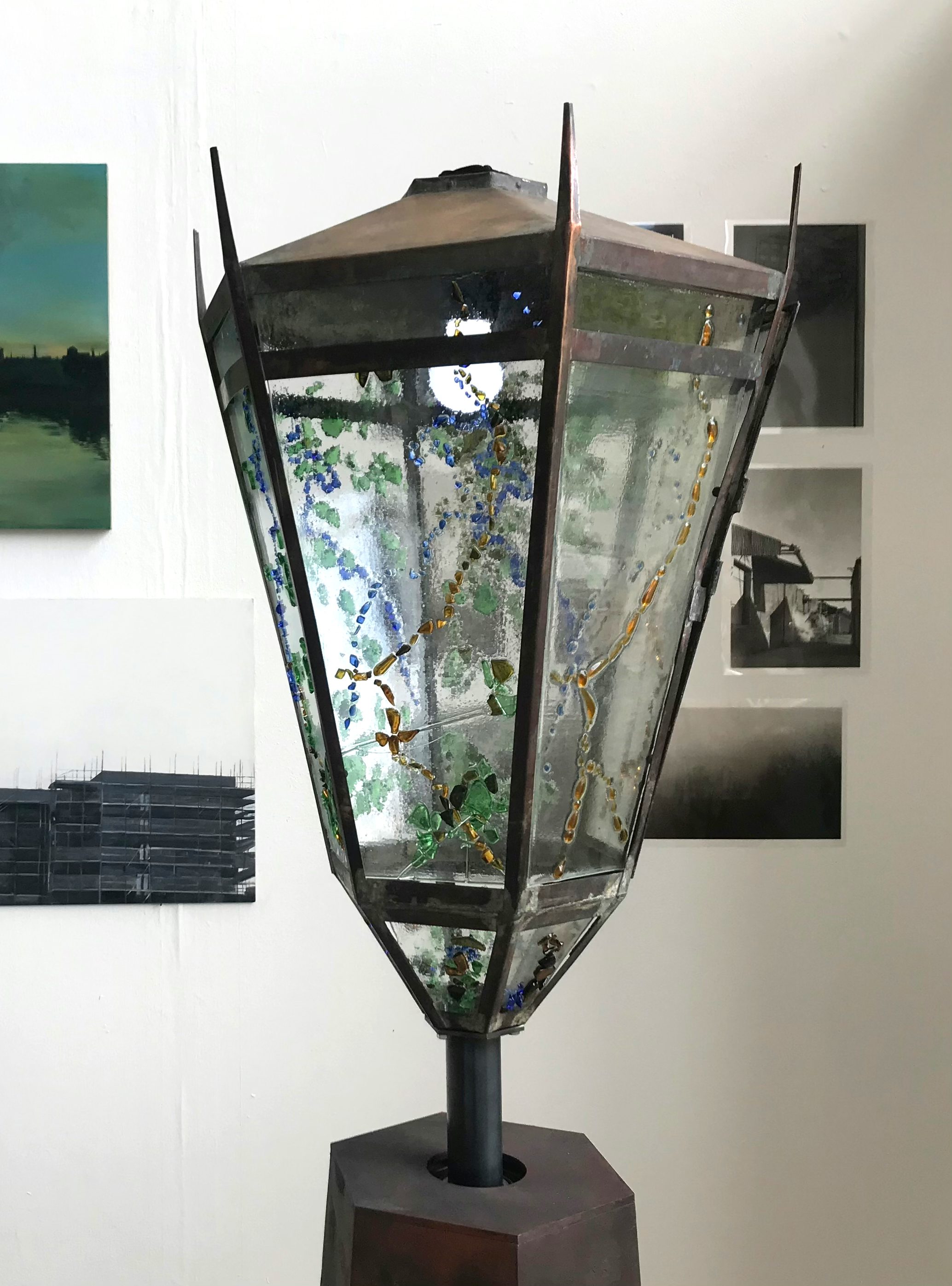 2023 Mixed media: wood, stained glass and found copper lamp head, 180 cm.